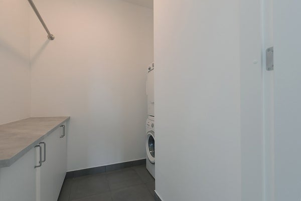 The open kitchen with cooking island and all kinds of equipment, such as a very large fridge/freezer, dishwasher, microwave/oven combination, induction cooking plate with extractor hood, TV, and lots of cabinet space. Next to the kitchen, there is an extra storage room. Two of the 4 sides in the living room are fully covered by windows to ensure lots of light enters the area.