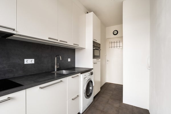The apartment has a separate kitchen and is fully equipped with all necessary built-in appliances, and a washing machine is also present. From the kitchen, there is direct access to the balcony.