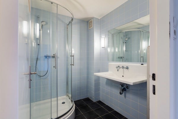 The spacious bathroom is equipped with a shower cabin, washbasin, and large mirror. A separate toilet is conveniently located in the hallway.