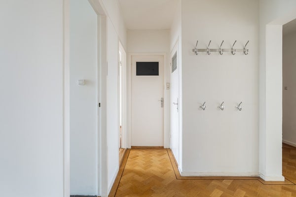 The apartment is accessed through a secured communal entrance with stairs leading to the second floor. Upon entering, you step into a spacious hallway that provides access to all rooms of the apartment.
