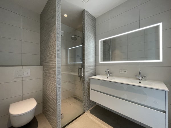 In the luxurious bathroom, there is a shower, double sink, mirror (with LED lighting), and toilet.