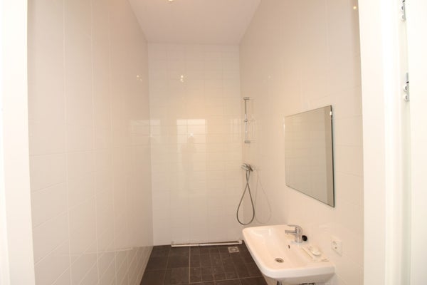 The brand-new bathroom has a stylish finish and is equipped with a sink and a spacious shower. There is also a separate toilet in the hall, which offers extra comfort.
