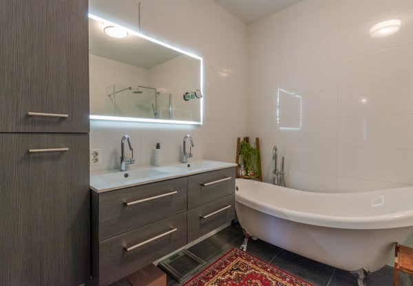 The bathroom is also fully equipped. It features a spacious bathtub, a double sink with storage space, and a walk-in shower with a hand shower and rain showerhead.