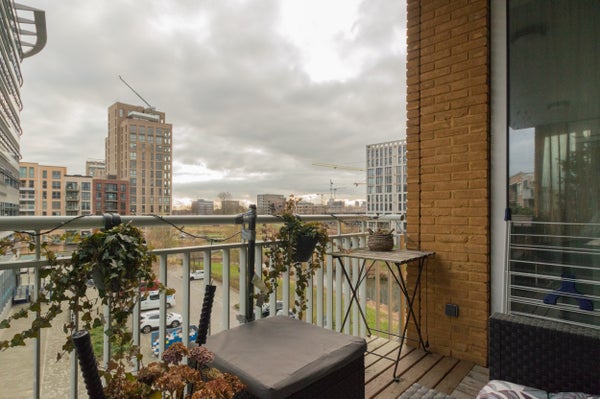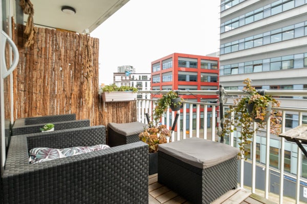 The large living room is connected to the open-plan kitchen. Both have large windows that allow plenty of natural light into the space, giving the room a very open and spacious feel. The balcony is also located off the living room.