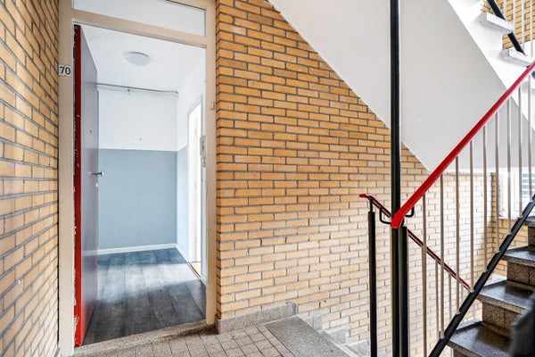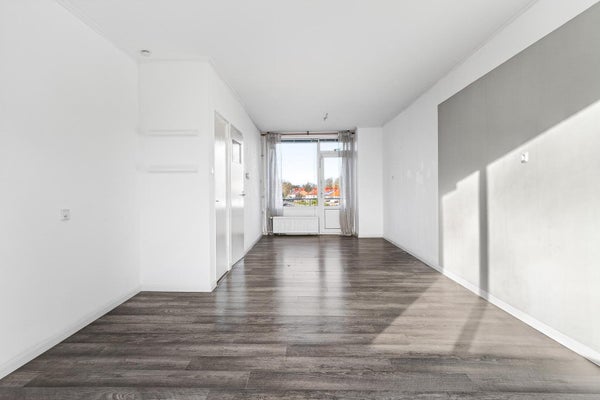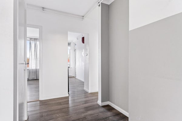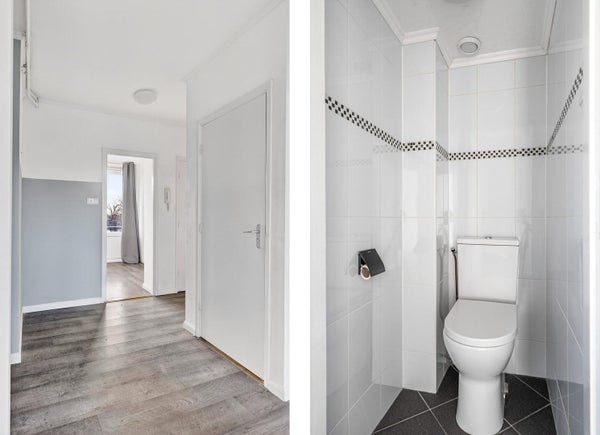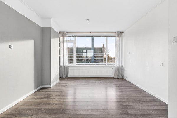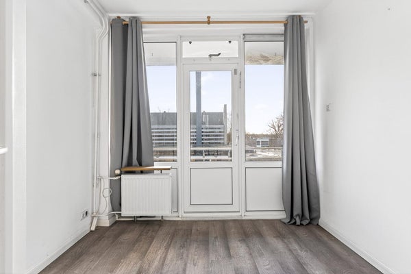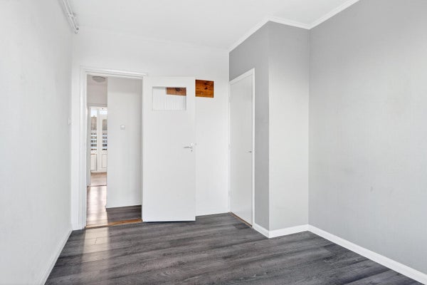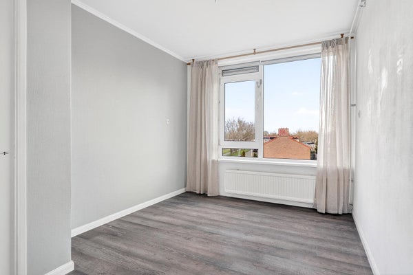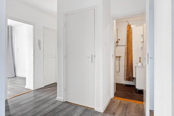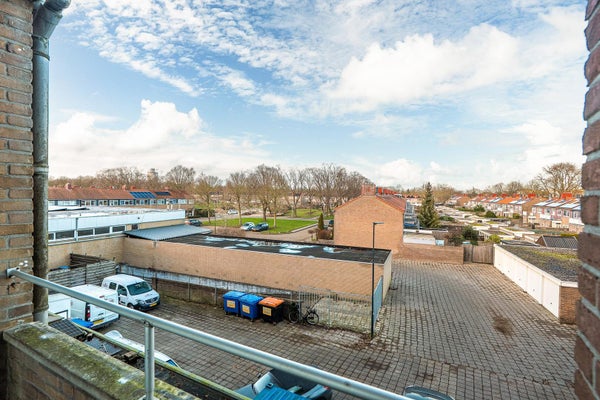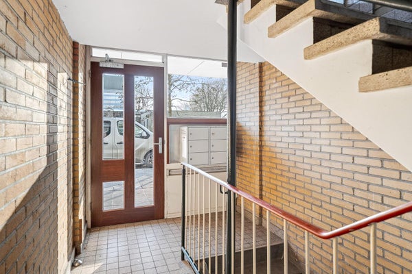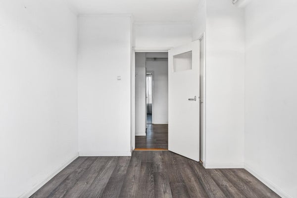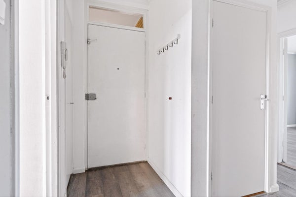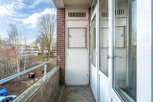 This well-maintained apartment on the 2nd floor features balconies on both the south and north sides. Access is through a secured entrance, leading to a hall that connects to the bright living room, kitchen, two bedrooms, and a renovated bathroom. The living room has a built-in closet, while the kitchen includes a washing machine connection. The modern bathroom and separate toilet add convenience. Both bedrooms come with built-in closets; one has access to the sunny south-facing balcony. With PVC window frames and an energy label B, the apartment is energy-efficient. It includes a private (bicycle) storage in the basement. The apartment is available for rent immediately for a minimum of one year.