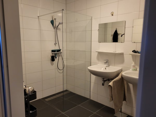 - (Partially) tiled bathroom equipped with shower and double sink;