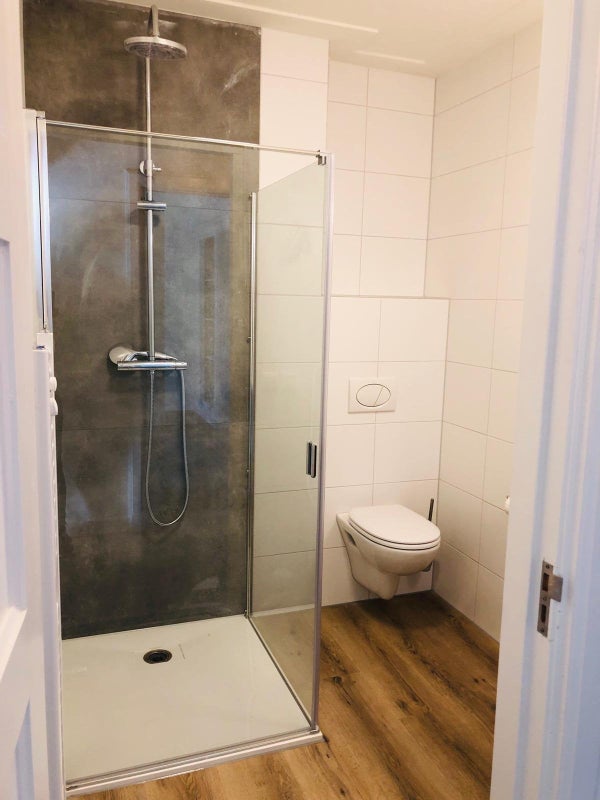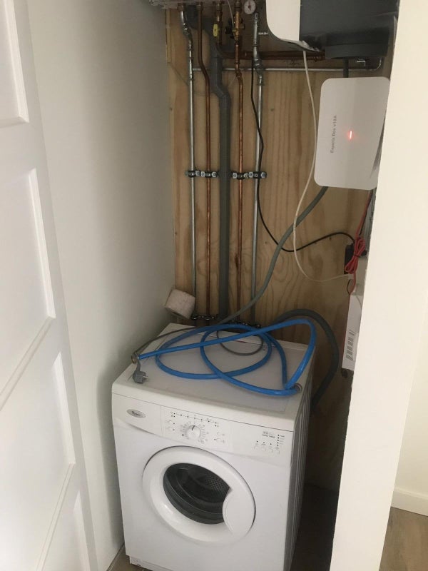 Modern bathroom which is equipped with a walk-in shower, toilet, and sink. Separate closet space with a washing machine.