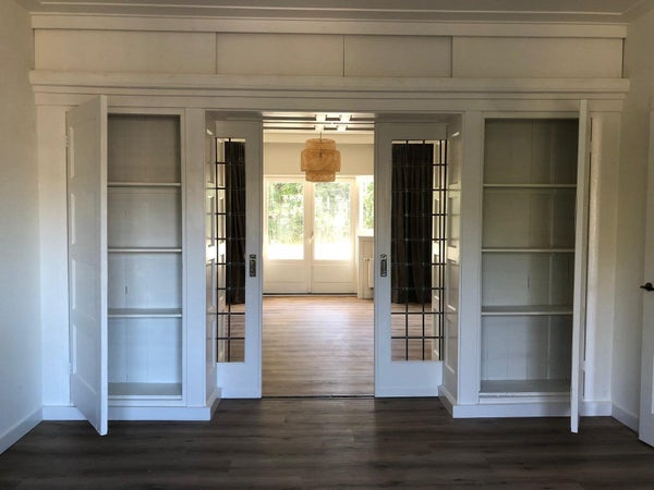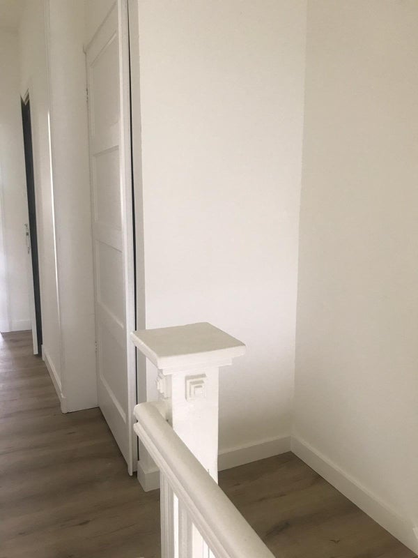 Entrance with stylish staircase to the 1st floor. Landing with access to the bright living room, with built-in closets, decorative fireplace, and sliding doors which offer the possibility of an (extra) bedroom. The apartment also has a sunny balcony at the rear.