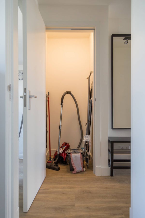 - The cloakroom contains vacuum cleaner, iron and an iron board.