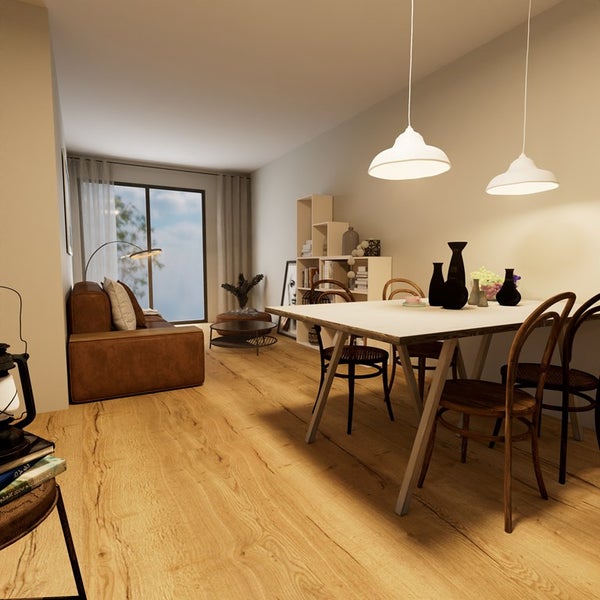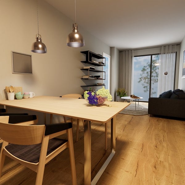 The property features a spacious and bright living room with ample space for both a seating and dining area. Thanks to the large windows, the room benefits from abundant natural light.