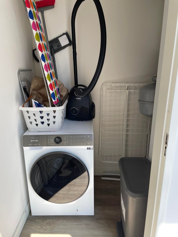 From the living room, there is also access to the internal storage room with connection for the washing machine.