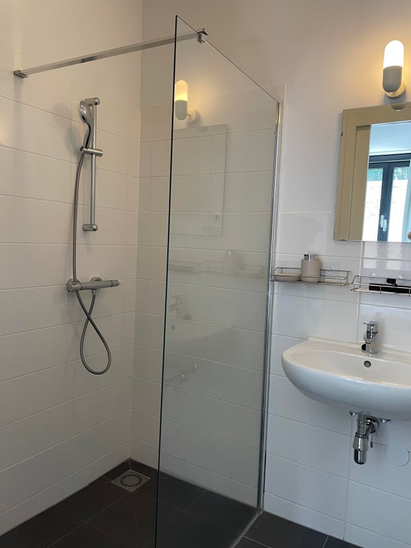 The fully tiled bathroom has high-gloss white wall tiles and anthracite floor tiles. The luxury bathroom is equipped with a walk-in shower with mixer tap, washbasin, and mirror.