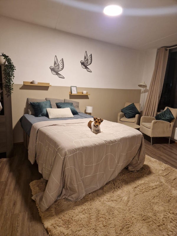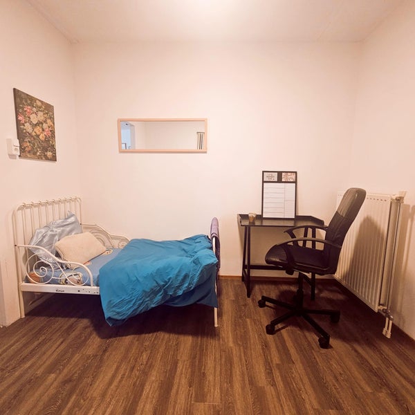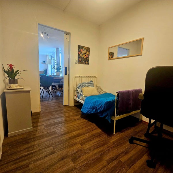 You enter into a large bright living room, with 3 large windows and curtains on 2 sides. The kitchen is large & spacious, contains an oven, refrigerator, gas hob, utensils needed for cooking & many storage shelves. You can reach the cv ketel, utility area & extra storage shelves via the small bedroom. The bedroom can fit a single bed and a cupboard, or also works as a kids room.