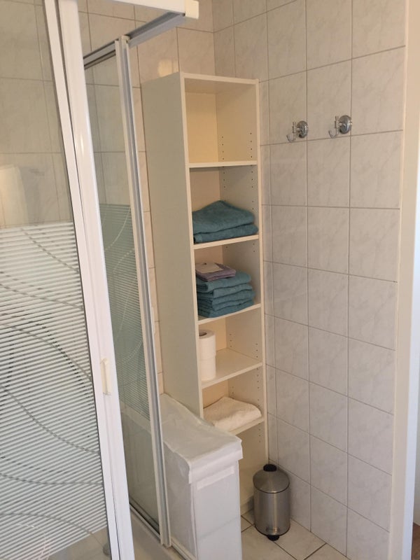 The bathroom can be reached from both the hall and bedroom 2. This spacious bathroom has a toilet, a shower and a sink with furniture. The connections for the washing machine and dryer are also located here.
