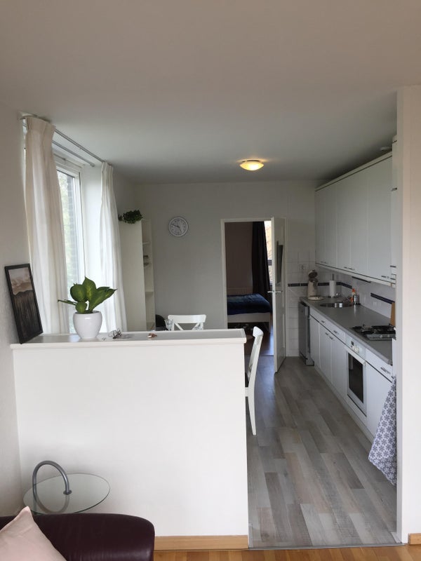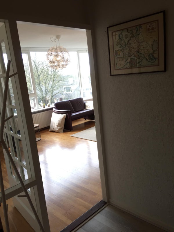 The living room of approximately 24 m2 has windows on two sides. Due to its location on a corner, it is a bright apartment with plenty of light. The living room also has a wooden floor. The kitchen is directly adjacent to the living room.