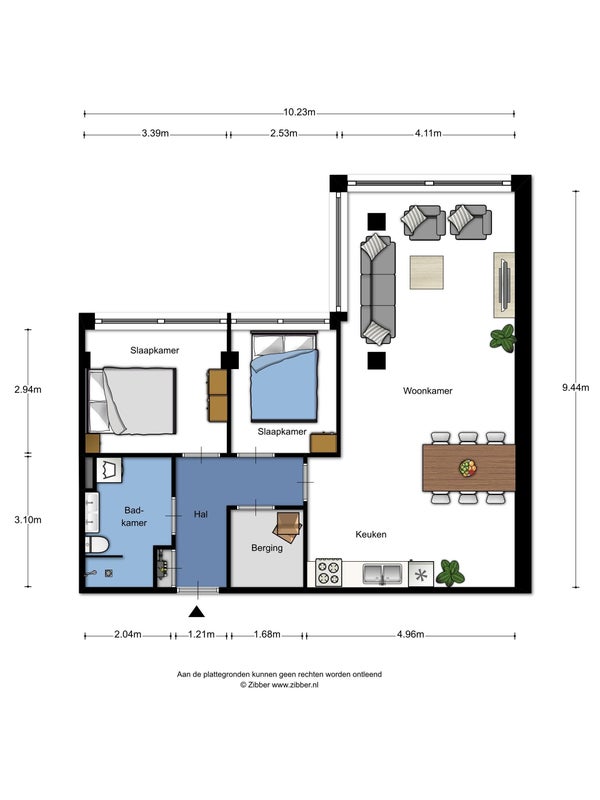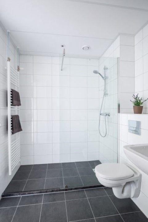 From the hall, both bedrooms and the bathroom are accessible. The fully tiled bathroom is equipped with high-gloss white wall tiles and anthracite floor tiles. The luxurious bathroom features a walk-in shower with mixer tap, designer radiator, washbasin, wall-hung toilet, and washing machine.