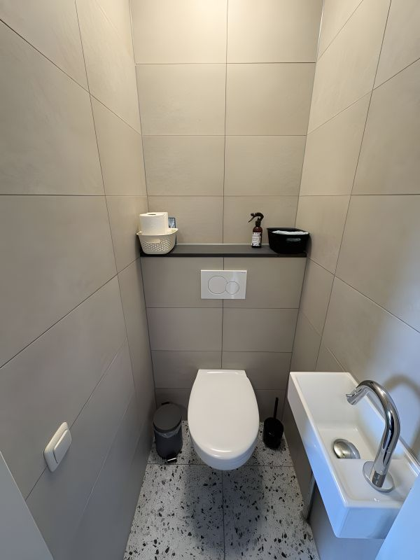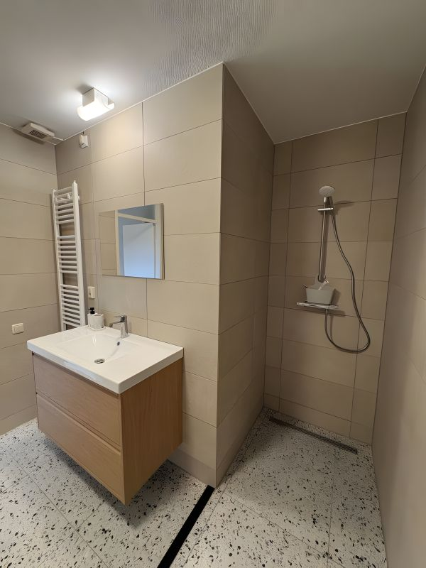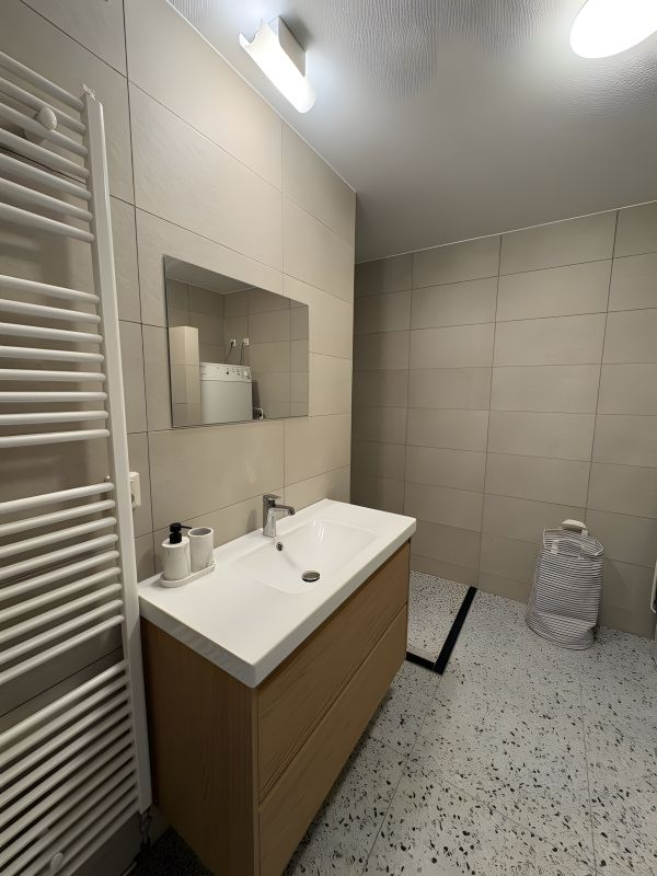 The modern bathroom is equipped with a walk-in shower as well as a separate bathtub. There is also a separate toilet, providing additional comfort.