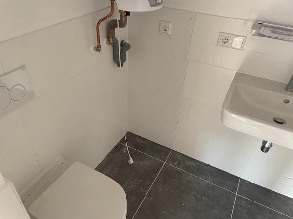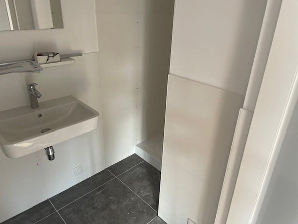 Modern bathroom with shower, sink, mirror and mechanical extraction, washing machine connection and toilet.