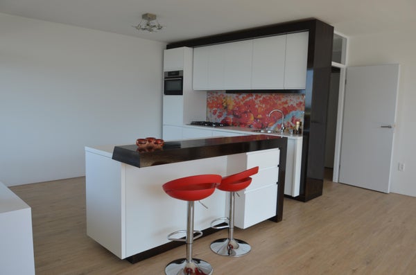 The apartment has a spacious living room and open kitchen. The luxury kitchen is equipped with combi microwave, dishwasher and fridge-freezer. In addition there is an extension of the kitchen with a bar. This bar is mobile so you can position it according to your own wishes.