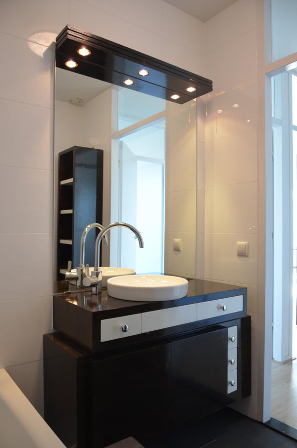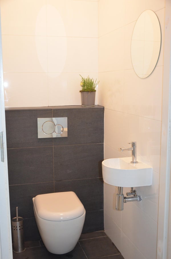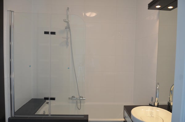 Spacious bathroom with bath / shower and nice bathroom furniture with large mirror. Separate toilet. Free hanging toilet with fountain.