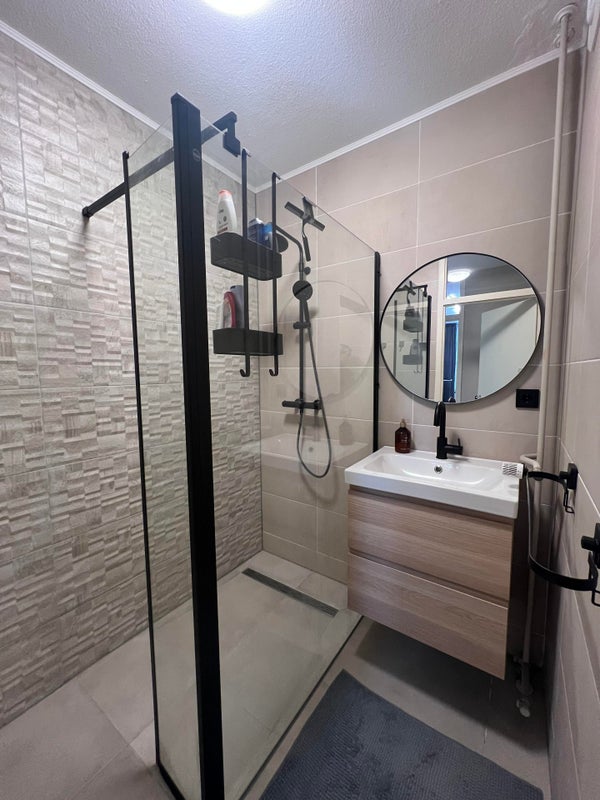 Sixth floor: Hall with access to 2 apartments. Front door. Central hall with PVC floor, intercom system, and access to all rooms. Steel door to spacious T-shaped living room. Large luxury, open kitchen with formal dining area and the following built-in appliances: 4-burner induction cooktop, extractor hood, combi-oven/microwave, refrigerator, freezer, and dishwasher. Access to a large covered balcony facing "West." Spacious bedroom/master bedroom with beautiful view and plenty of closet space. Study/work room/guest room with large fixed mirrored closet wall. Modern tiled bathroom, equipped with vanity unit and walk-in shower. Adjacent laundry room with washing machine and mechanical ventilation. Separate toilet room with wall-mounted toilet and small sink. Spacious 2nd bedroom with closet wall and access to the 2nd balcony on the East side.