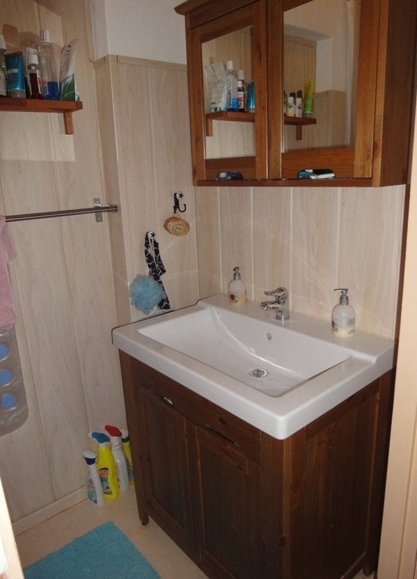 Bathroom equipped with a bathtub with shower and washbasin cabinet.