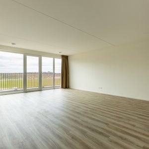 Apart from the wet areas, the entire intermediate apartment has a beautiful, warm PVC floor with underfloor heating. The large windows from ceiling to floor provide plenty of natural light and a spacious feeling. The windows are fitted with luxurious blinds or blackout curtains. The living room with open kitchen is spacious. The modern kitchen with white cabinets and black steel handles is equipped with stainless steel Bosch built-in appliances, namely a fridge-freezer, induction hob, dishwasher and oven-microwave. From the living area there is a door to the large balcony with beautiful unobstructed views.
