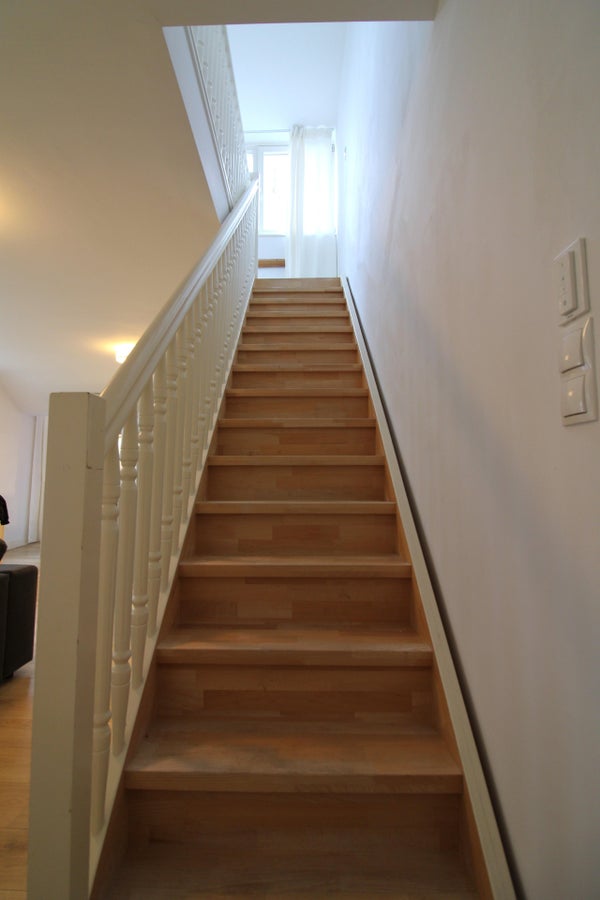 Staircase to an extra room located on the second floor, which is ideal for use as a study and/or guest room.