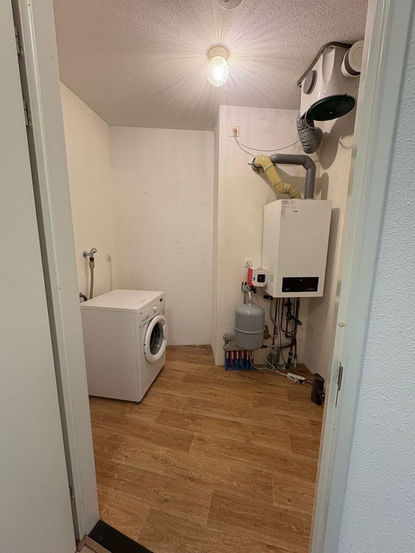 Spacious living room, two bedrooms of which one is very spacious, semi-open kitchen, bathroom and separate toilet. A nice spacious balcony. Separate storage room with connection for washing machine and central heating. Another storage room downstairs and private parking in the basement.