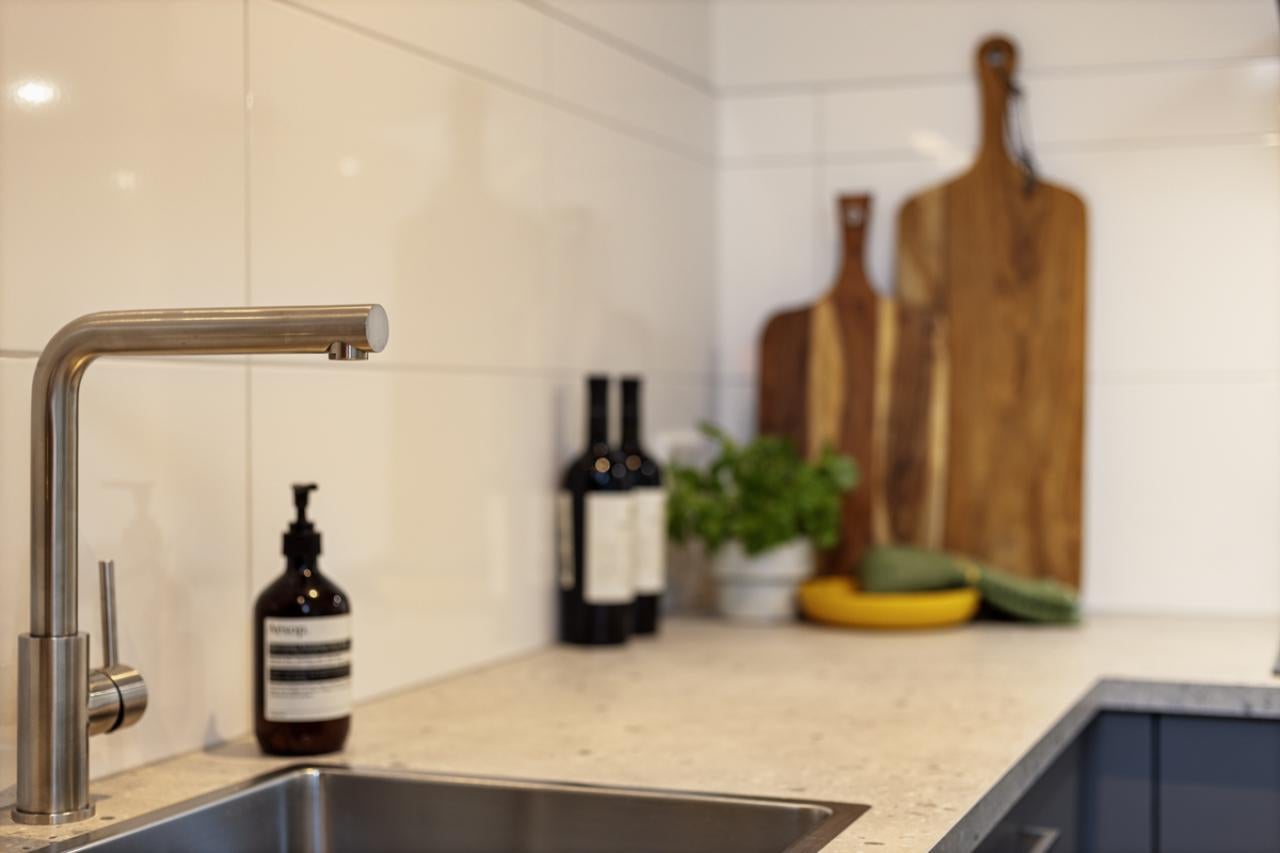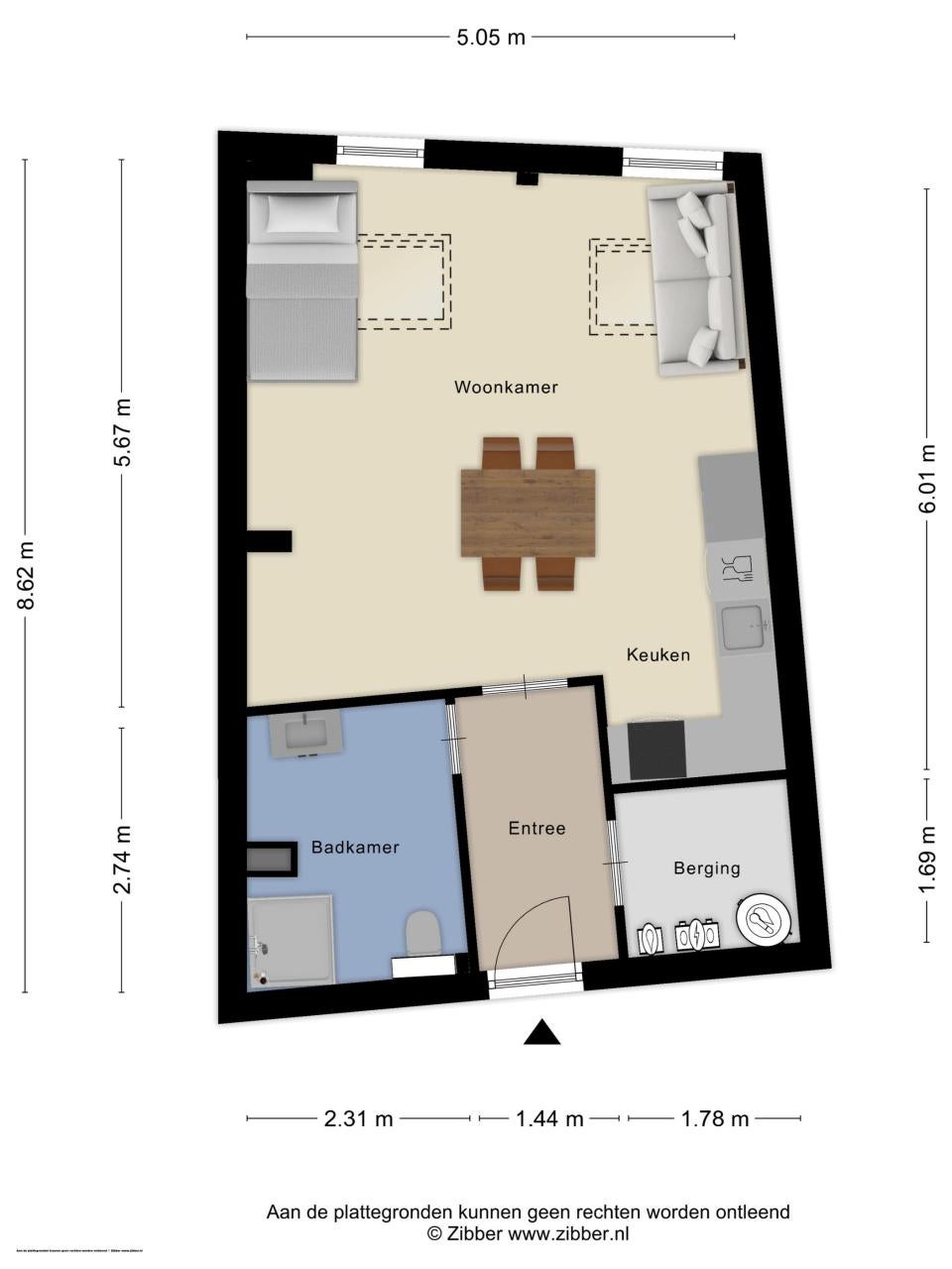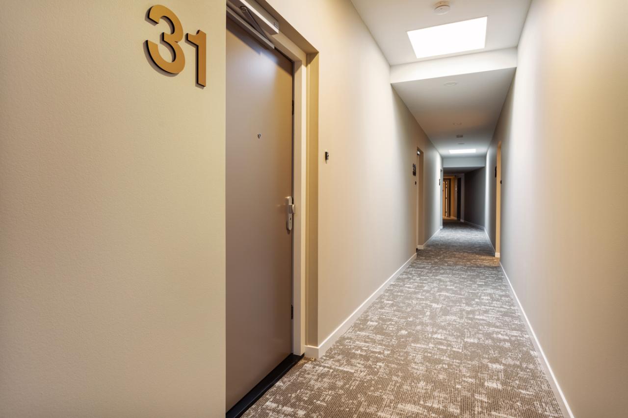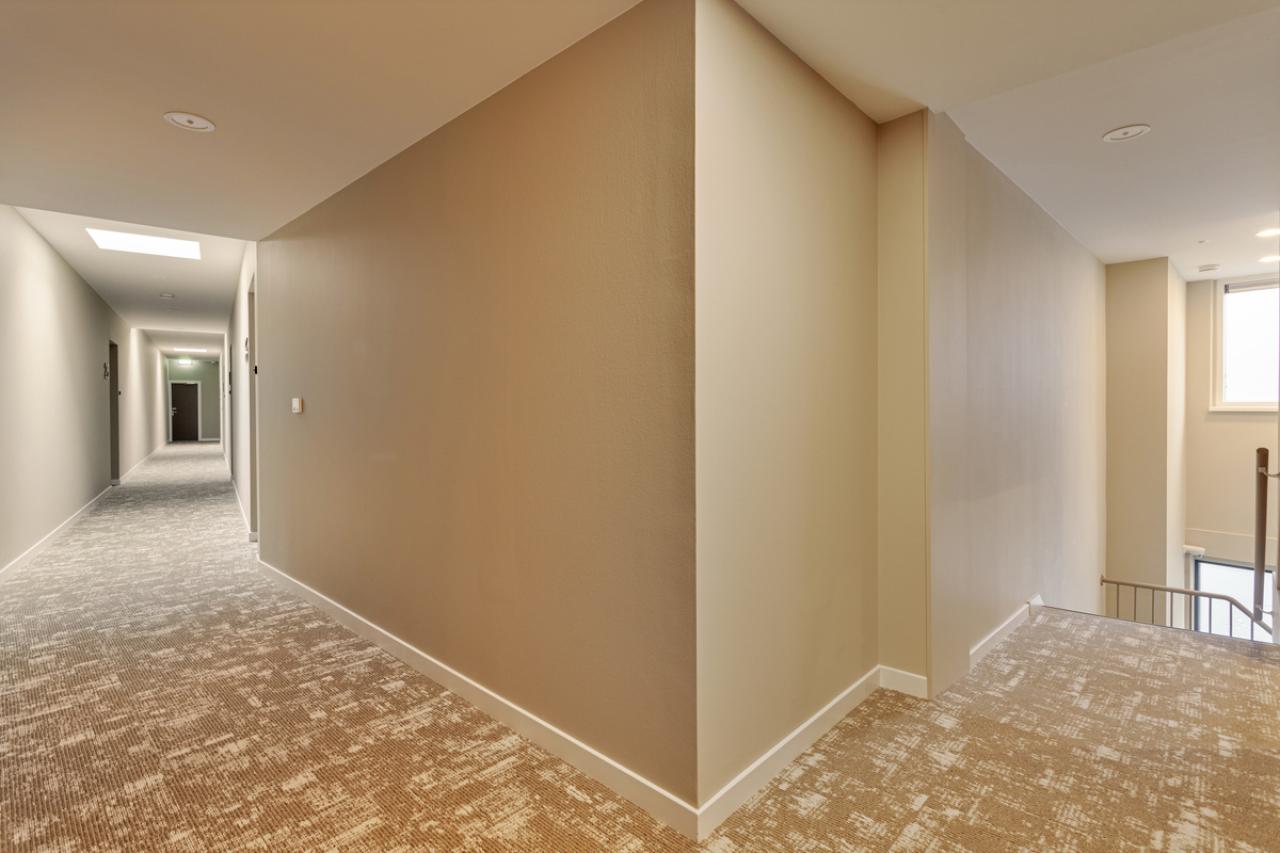 This studio apartment makes it easy to create a separate sleeping area. The bathroom features a walk-in shower and underfloor heating. With a living space of 45 m², the apartment is fully insulated and energy-efficient (label A).