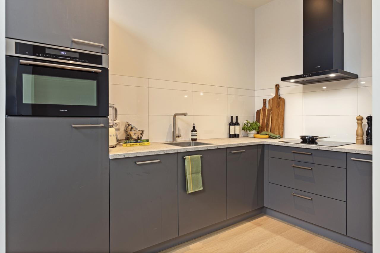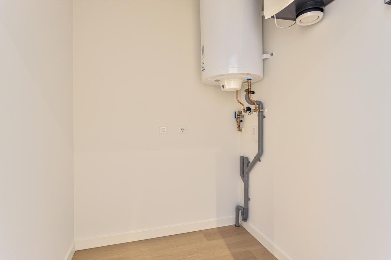 The apartment has a rent of € 869 per month and service costs of € 95. You enter through a spacious hall with access to the living area and technical room for the washing machine. The living room connects seamlessly to a modern kitchen equipped with built-in appliances like a microwave and dishwasher.