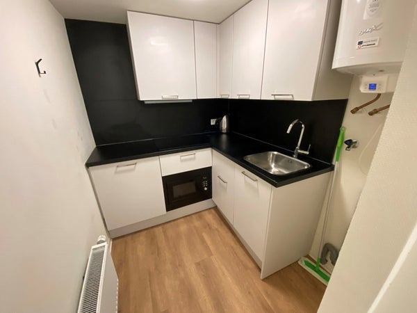The studio is located on the first floor of the building and has a total area of 22.18 m². You enter through the hall, which gives access to the kitchen, living room/bedroom, and the bathroom. The kitchen is equipped with an induction cooktop, combi oven, extractor hood, refrigerator, and dishwasher. The bathroom has a shower and sink.
