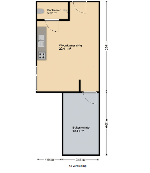 Raamstraat 8-C (Photos 8–12) is located on the first floor and has a living area of approximately 30 m². The living/sleeping area has an open kitchen equipped with a refrigerator, induction hob, combi oven/microwave, dishwasher and extractor hood. The bathroom is equipped with a shower, toilet and sink. In addition, the studio has a separate bedroom.