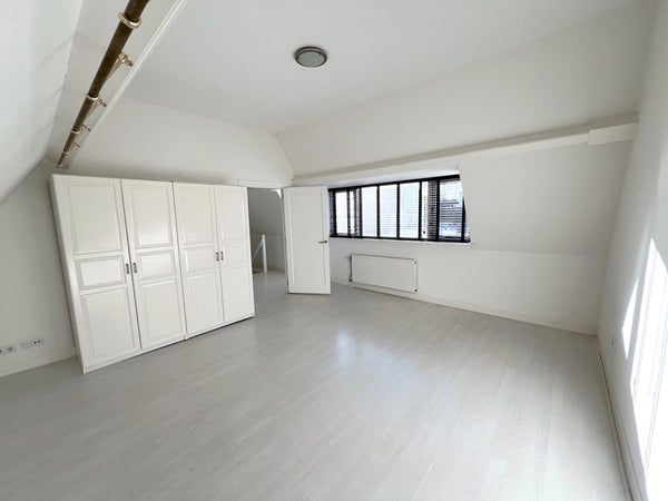 We offer a spacious and bright 3 room duplex apartment of approx. 110 m2 located on the first floor of a renovated national monument in the main shopping street of Haarlem ‘de Grote Houtstraat’. The property at the back is characterized by the high ceilings, bright atmosphere, a semi open kitchen, the haring bone pvc floor, well sized bathroom and balcony facing West. The apartment has a view of the gardens behind the main street and has a loft feel about it. Because all rooms are located at the rear of the building you can enjoy both a lively neighborhood of the city of Haarlem but have the tranquility at home.
