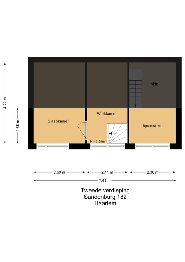 The bedrooms at the front of the apartment are surprisingly spacious and versatile. The master bedroom is tastefully furnished with a comfortable double bed and a calming color scheme. The adjacent room currently serves as a professional home office, with a wide desk under the characteristic wooden staircase. The third room on this floor has been cleverly converted into a walk-in closet, maximizing the available space. The bathroom features modern tiling and is equipped with a sleek vanity and a spacious walk-in shower. The apartment also has a separate toilet and a practical storage cupboard with the washing machine connection.