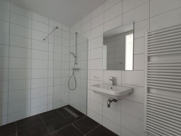 - (Partially) tiled bathroom equipped with walk-in shower with glass shower screen and washbasin with mirror;