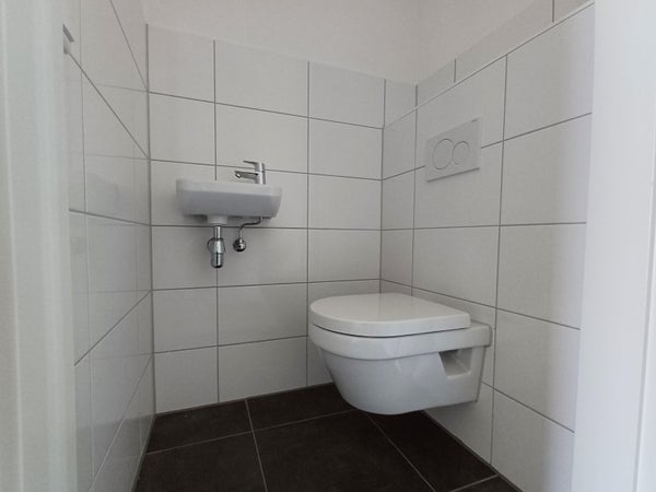 - (Partially) tiled toilet room equipped with a wall-mounted toilet and small sink;