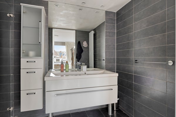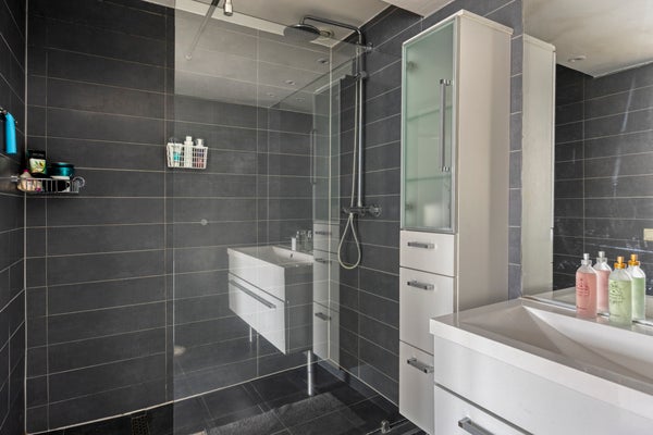 The master bedroom, furnished with a double bed and wardrobe, is accessible through the living room. From this bedroom, you enter the spacious bathroom with a wide sink and a walk-in shower.