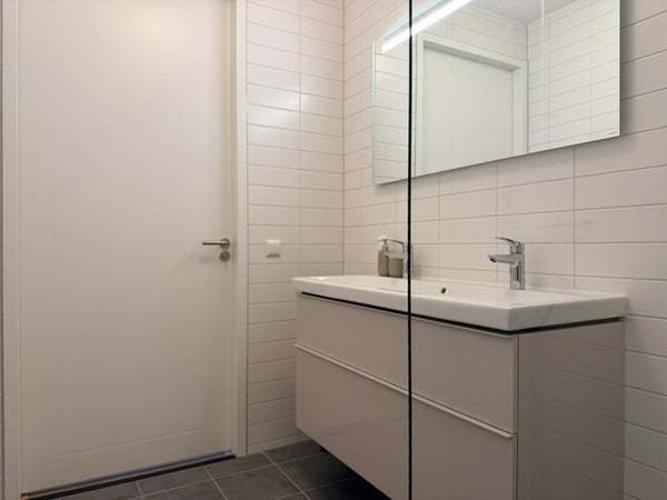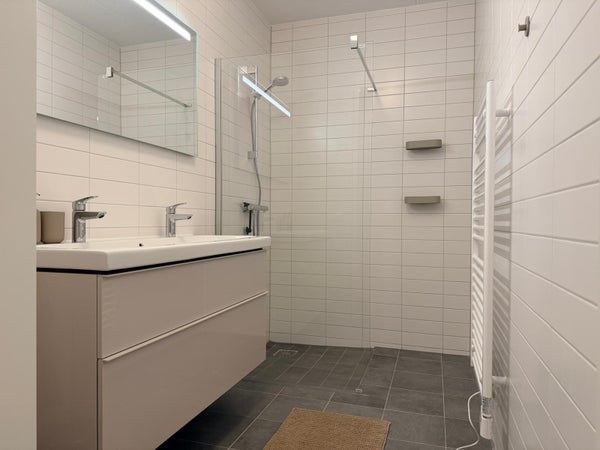 The apartment features two bedrooms, both of a good size. The master bedroom is also equipped with a built-in wardrobe. The bathroom is finished in a neutral color scheme and features a walk-in shower, towel radiator, and washbasin with vanity unit and mirror. Key facts: