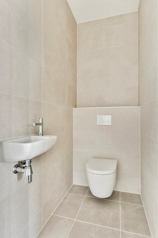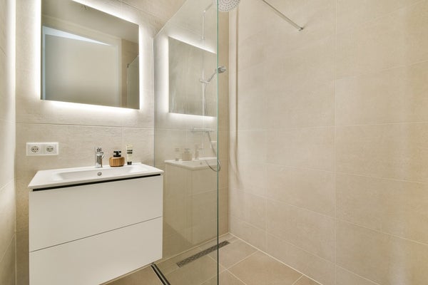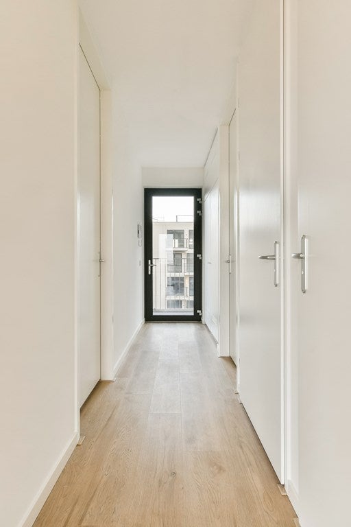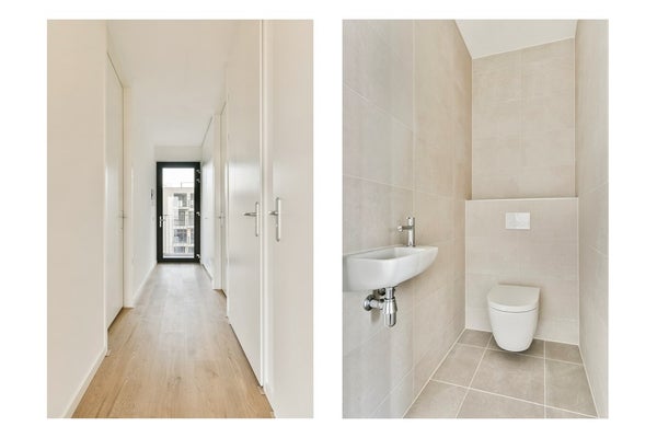 Sixth Floor: Take the elevator to the sixth floor, where your new apartment awaits. Once inside via the gallery, a spacious hallway welcomes you. Here you will find a cupboard for the heat pump, a meter cupboard, and a modern toilet with a hand basin. The stylish bathroom is equipped with a beautiful vanity and a comfortable walk-in shower, finished with high-quality Porcelanosa tiles and Duravit sanitary ware.