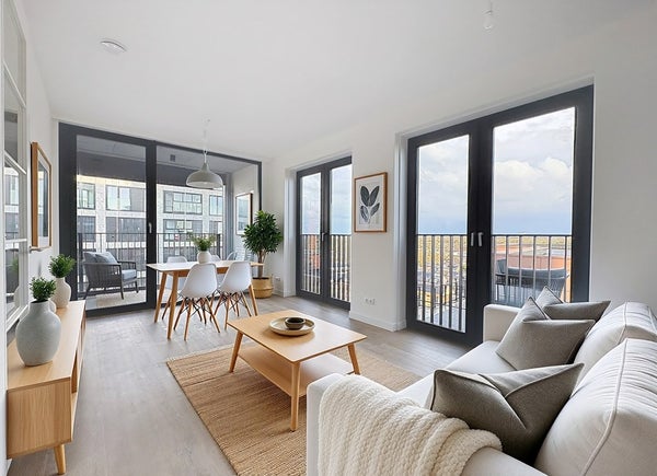 The living room features an open-plan kitchen with built-in appliances. The apartment has two bedrooms, one of which is ideal as a workspace or guest room. The luxurious bathroom includes a walk-in shower and sink, with a separate toilet.