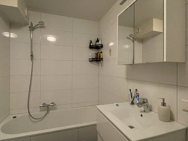 Modern bathroom: the bathroom was renovated in 2015 and features a bathtub, shower, and a sink with matching furniture.
