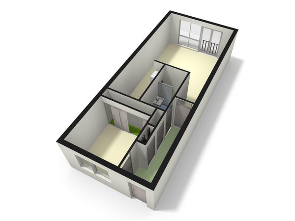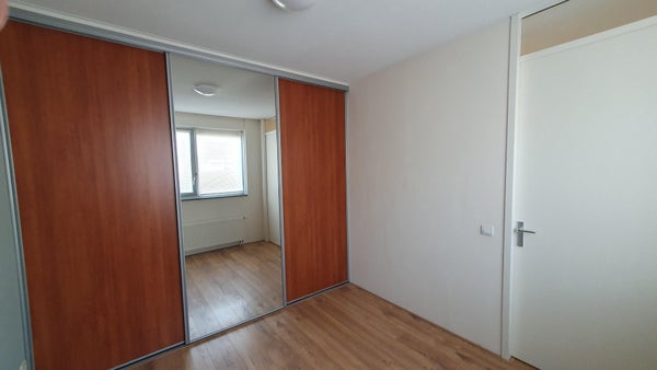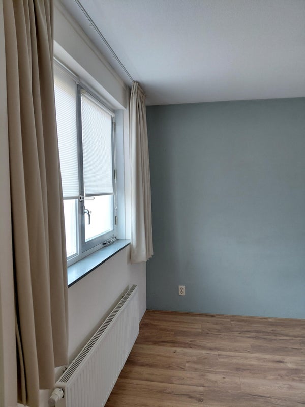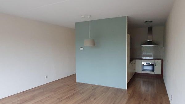 The apartment features a cozy living room with unobstructed views and a French balcony. There is a terrace in front of the apartment where you can enjoy the afternoon and evening sun. The kitchen is accessible from the living room and equipped with various built-in appliances. From the hallway, with a built-in closet, you can reach the other rooms such as the bedroom and the bathroom. This light-tiled bathroom is equipped with a toilet, shower, sink, radiator, and space for a washing machine and dryer. The entire apartment has a neutral laminate floor.