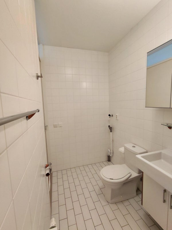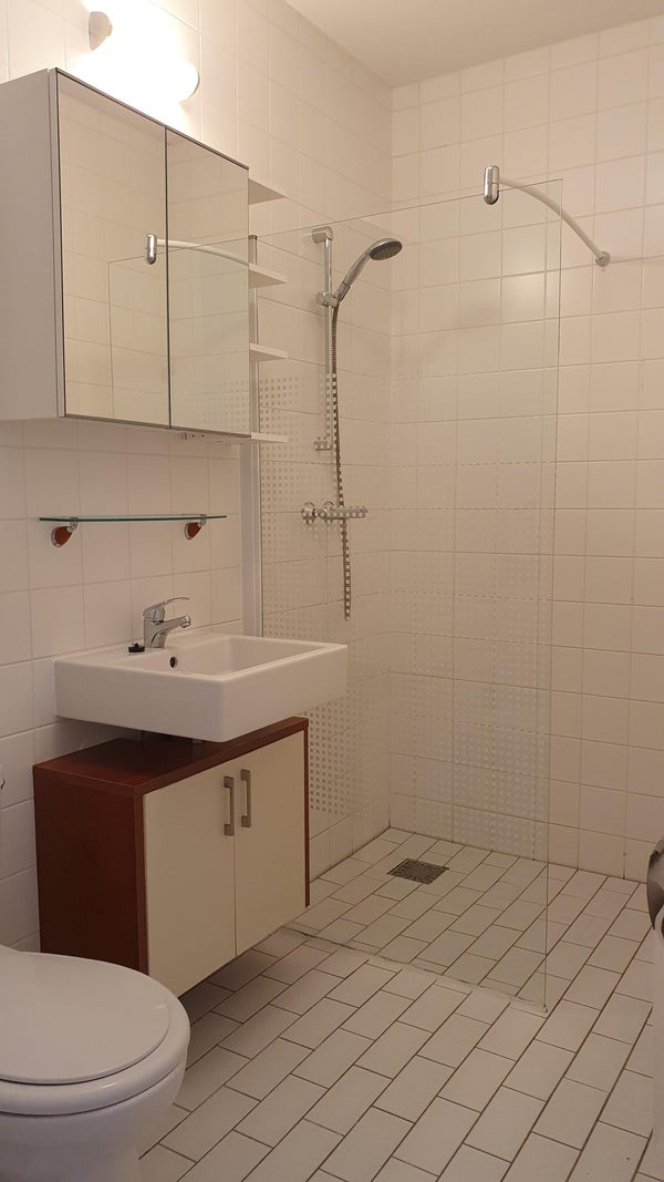The layout is as follows: Entrance/hall and corridor with access to the bedroom, meter cupboard with district heating unit, built-in closet with mechanical ventilation box, bathroom with sink, shower, radiator, and space for a washing machine and dryer.