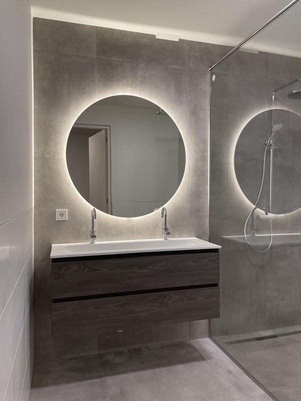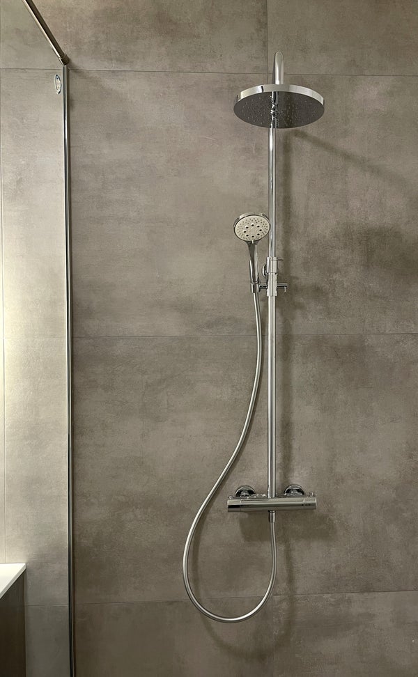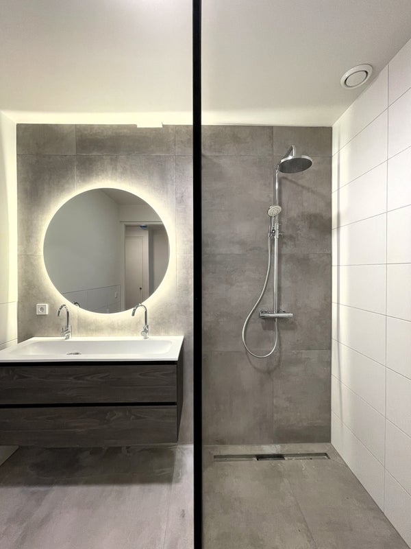 The bathroom exudes calm and luxury, featuring a comfortable walk-in shower and a stylish vanity. There’s also a practical space for both a washer and dryer. In addition, you’ll find a separate toilet and a technical room for extra storage.