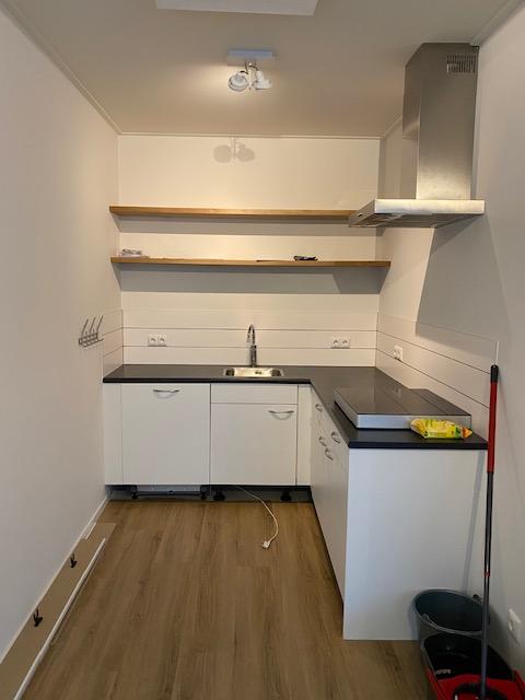 The apartment is located on the ground floor of the building. You enter the hallway, which gives access to a spacious and bright living room with an open kitchen. The kitchen is equipped with an induction cooktop with an extractor hood and a dishwasher.