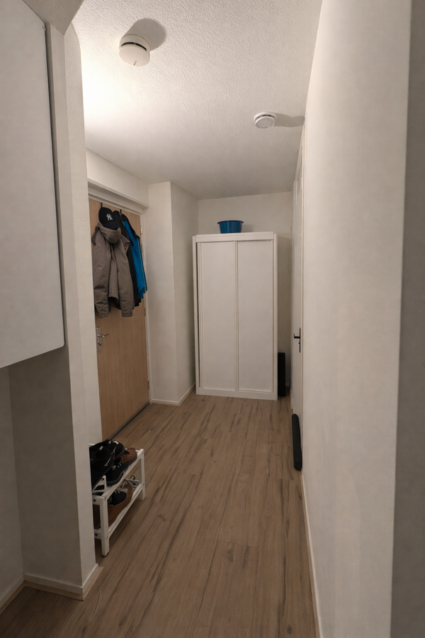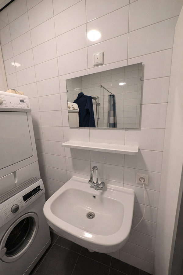 Upon entering, there is immediately a modern kitchen with all necessary appliances, such as an induction hob, a combi oven/microwave, a fridge/freezer, an extractor hood, and a dishwasher. To the right upon entering is a tidy bathroom with toilet, sink, semi-enclosed shower, and a connection for the washing machine. The back half of the studio is the living area. There is space for a living/sleeping area.
