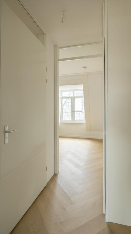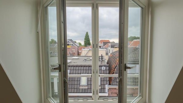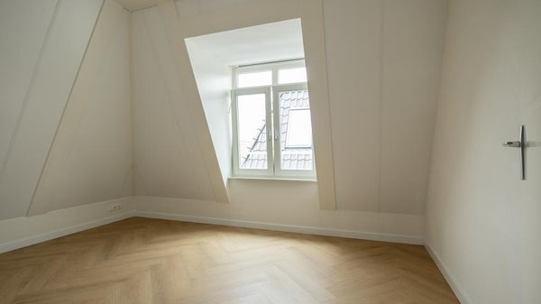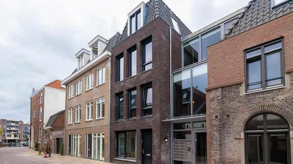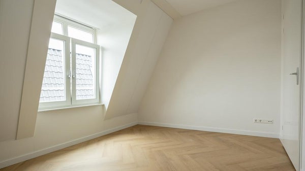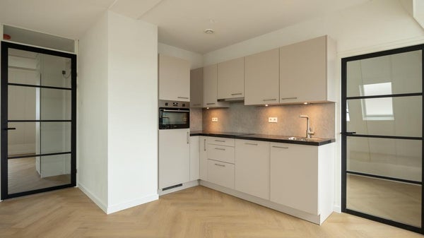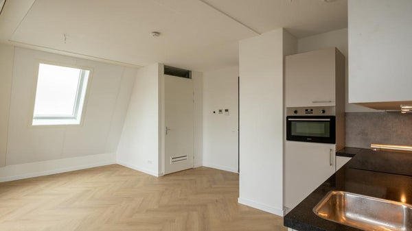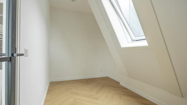 This exceptionally well-located corner apartment, featuring a super-modern finish, is available in the popular courtyard known as ‘Smits Hof.’ The apartment is located on the third floor, with the entryway providing access to nearly all rooms. The living room has a spacious layout and is pleasantly bright thanks to the charming dormer windows and various skylights. The kitchen is also brand new and equipped with all modern conveniences, including an induction cooktop, oven-microwave combination, dishwasher, and refrigerator with freezer compartment. The utility room with a heat pump also has connections for a washer and dryer. From the kitchen, there is access to the home office/study. Located at the rear is the master bedroom, and the modern bathroom features a toilet, a sink with a vanity cabinet, an illuminated mirror cabinet, and a walk-in shower with a glass wall and folding door. The property is rented unfurnished and equipped with air conditioning in the living room and bedroom. The energy rating is very favorable, and with a private heat pump as well as shared solar panels, utility costs will be very low. On the ground floor are the bicycle storage area and the garden for shared use. There are several restaurants in the harbor, and Leiden’s center is within walking distance, as is public transportation.