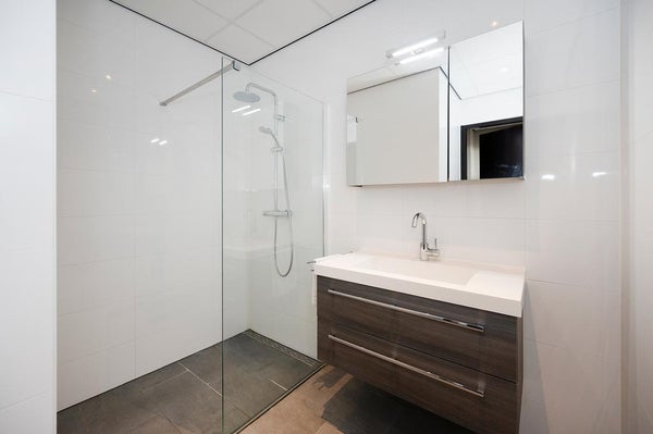 Luxuriously finished with high-quality materials, featuring a spacious shower and modern vanity unit.