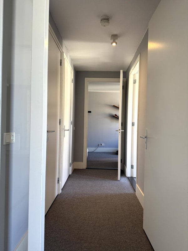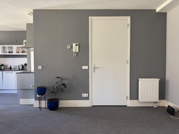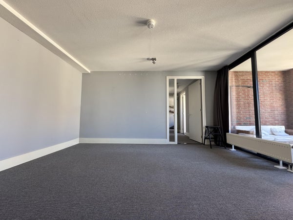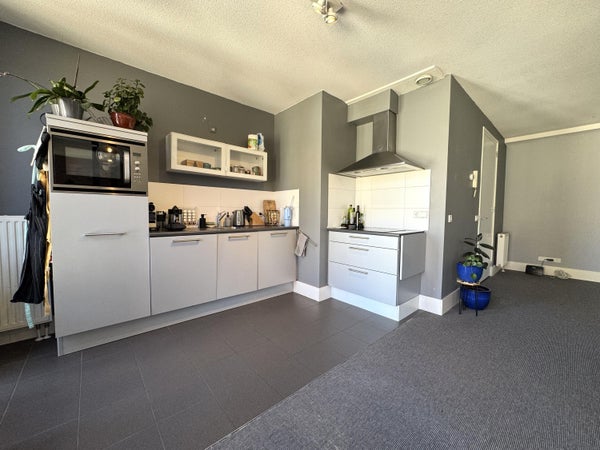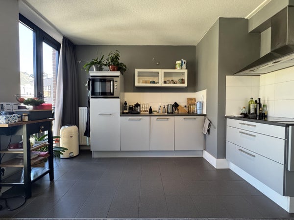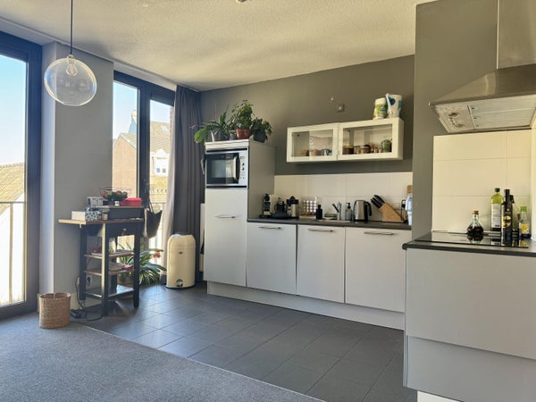 The living room is spacious and light, creating a nice living space where you immediately experience the vibrant city center feel. The semi-open kitchen seamlessly connects to this and is equipped with various built-in appliances, including an induction hob, microwave, refrigerator, and extractor fan. From both the living room and kitchen, you have access to the balcony/loggia of approximately 8 m², a pleasant place to sit outside and enjoy the atmosphere of the inner city.